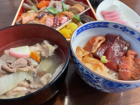 お雑煮はみんなに「えーーーー?」って言われるけど、いつも白菜を入れてます。椎茸も人参も飾り切りではなく、細かく切っただけで、白出汁で味付けしたけんちん汁のようなものにお餅を入れて食べてます。いつもこんな感じです。あとは昨日の残りのお刺身をお醤油漬けにしておいた漬け丼。冷凍ご飯で作ったけど、それなりに美味しかったです。